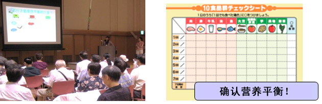 首先,由保健所的营养师,关于营养平衡的饮食作了讲解。还为我们准备了10食品类的检查单,来确认自己的饮食是否营养平衡。通过这个检查单能够确认昨天的饮食,一看就知道营养平衡结果,由此,进一步考虑对饮食的注意。 |